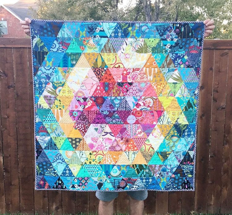 This quilt is a Patchwork Prism Quilt made out of only Anna Maria Horner fabric. I decided to join some fellow quilters on Instagram in an Anna Maria Horner sew-along at the beginning of September. The rules for the sew along were very relaxed. We just needed to finish a quilt (or quilt top) by the end of October that was made entirely in Anna Maria Horner fabric.
